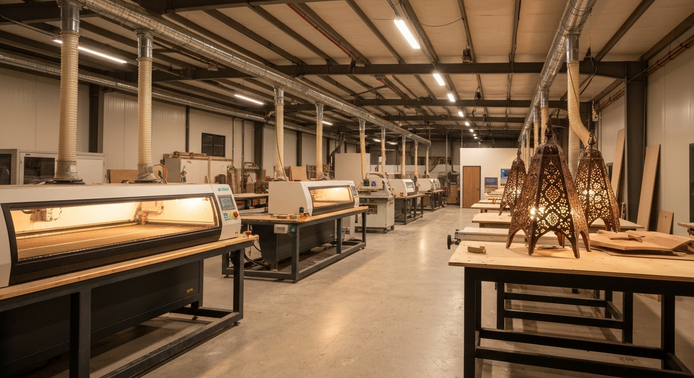 Fondée à Oued Amlil en 2025, Woodenglow Maroc révolutionne le luminaire marocain en combinant MDF premium, technologie laser de pointe et assemblage artisanal.